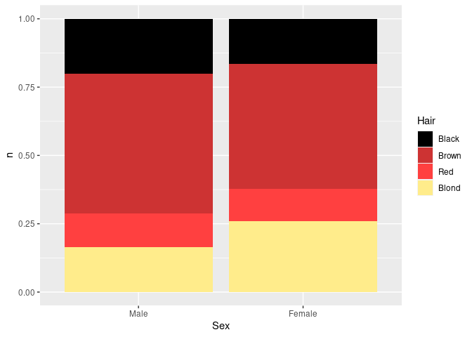 geom_col(aes(x = Sex, y = n, fill = Hair), position = "fill") +